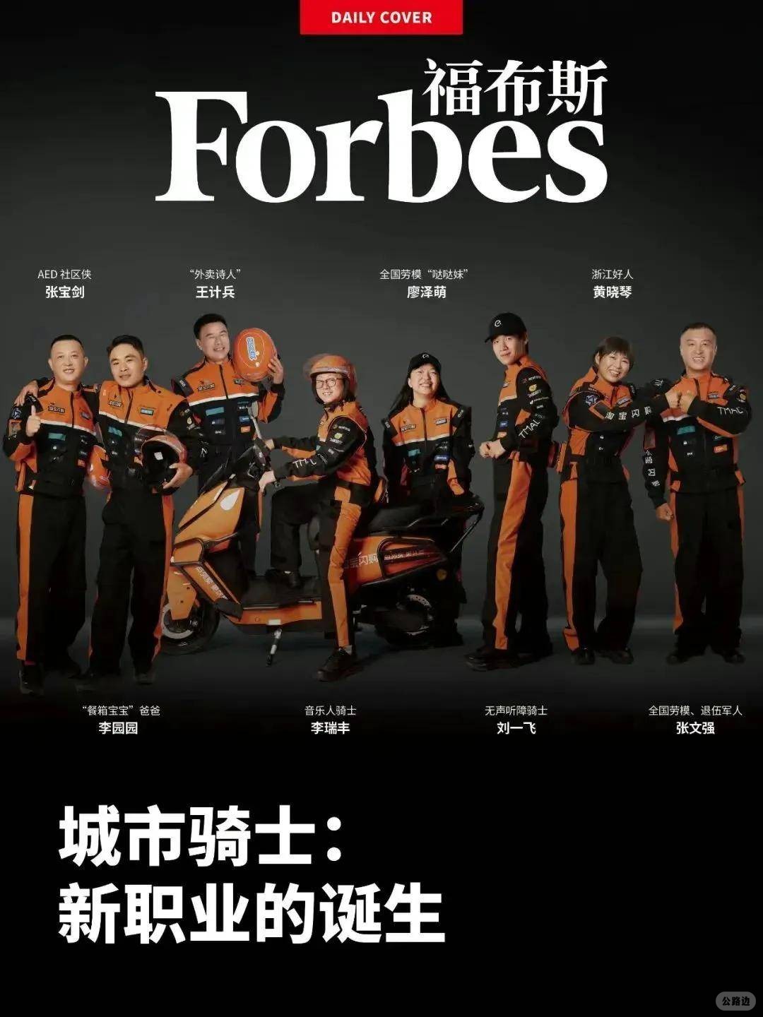 制服右袖卡袋还专门设置了透明信息袋,可以存放骑士的血型、过敏原和紧急联系人等信息。紧急状况下,第一时间就能提供关键信息,救助外卖骑手的生命。 新工装还具有极强的宣传效应,胸前一侧绣着“淘宝闪购”Logo、另一侧绣着“饿了么”Logo,前后面还可密集露出淘宝闪购、1688、钉钉、盒马、饿了么、支付宝、夸克、飞猪、阿里云、高德地图、盒马、大麦等阿里系核心业务的品牌Logo,是工装,也是 阿里巴巴“行走的广告牌”。 黄景瑜、李治廷在优酷综艺《风驰赛车手》中都上身演绎过这款新工装,这身材、这脸蛋、加上这设计,与穿赛车服的效果毫无差距啊。 淘宝闪购还邀请了八位外卖员身着新制服拍摄大片,为“城市骑士”代言,照片登上了《福布斯》杂志封面!外卖员们一手端着头盔一手插兜,看起来下一秒就要去城市各个角落掀起“Ridercore”的酷帅风潮。 每天穿梭于大街小巷的外卖员,他们的身影和着装构成了一座城市不能被忽视的风景线,当他们的工作服在实用的基础上又增加了“好看”的成分,自然而然也能提升这道城市风景线的美感,让城市充满进取、鲜活又时髦的生命质感。 同时,一件实用又美观的工装,还能重新定义劳动者及其所从事职业的社会地位,进而改变整个社会对这一职业的眼光。