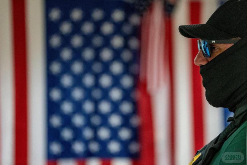 中国驻美国大使馆称,近期十多名中国留学生在入境美国时,被反复盘问、滋扰甚至遣返。图为一名美国海关和边境保护局官员站在美国国旗下。