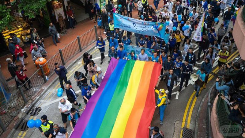 香港立法会9月10日否决《同性伴侣关系登记框架条例草案》。 图为香港2017年同志游行队伍拉出巨幅彩虹旗。