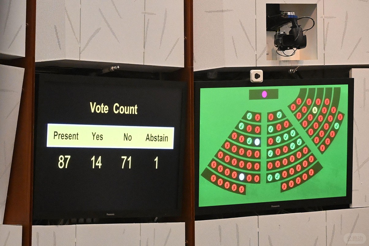 这也是香港2021年以“爱国者治港”为由改革选举制度、立法会几乎清一色由建制派议员组成后,港府提交的法案首次被立法会否决。 9月10日议会现场的电子屏幕显示,香港立法会以14票赞成、71票反对、1票弃权否决《同性伴侣关系登记框架条例草案》。