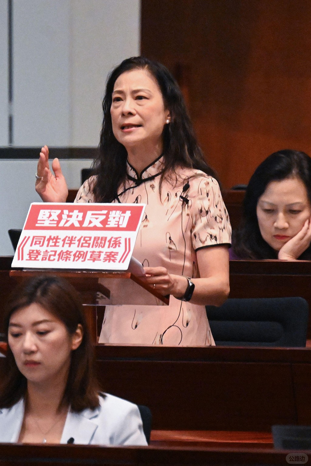 从表决结果来看,建制派占主导的立法会强烈反对法案,来自民建联、自由党、工商专业联盟、香港工会联合会等主要政党和团体的议员几乎全数投下反对票。 表决开始前,香港立法会议员陈曼琪在会上发言,并举着写有“坚决反对《同性伴侣关系登记条例草案》”的标语牌。