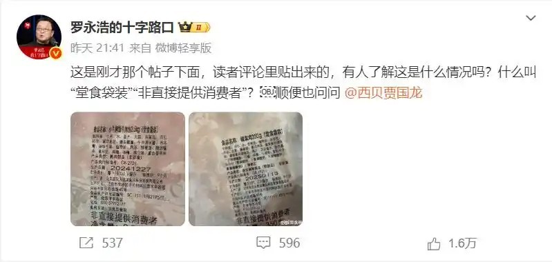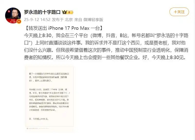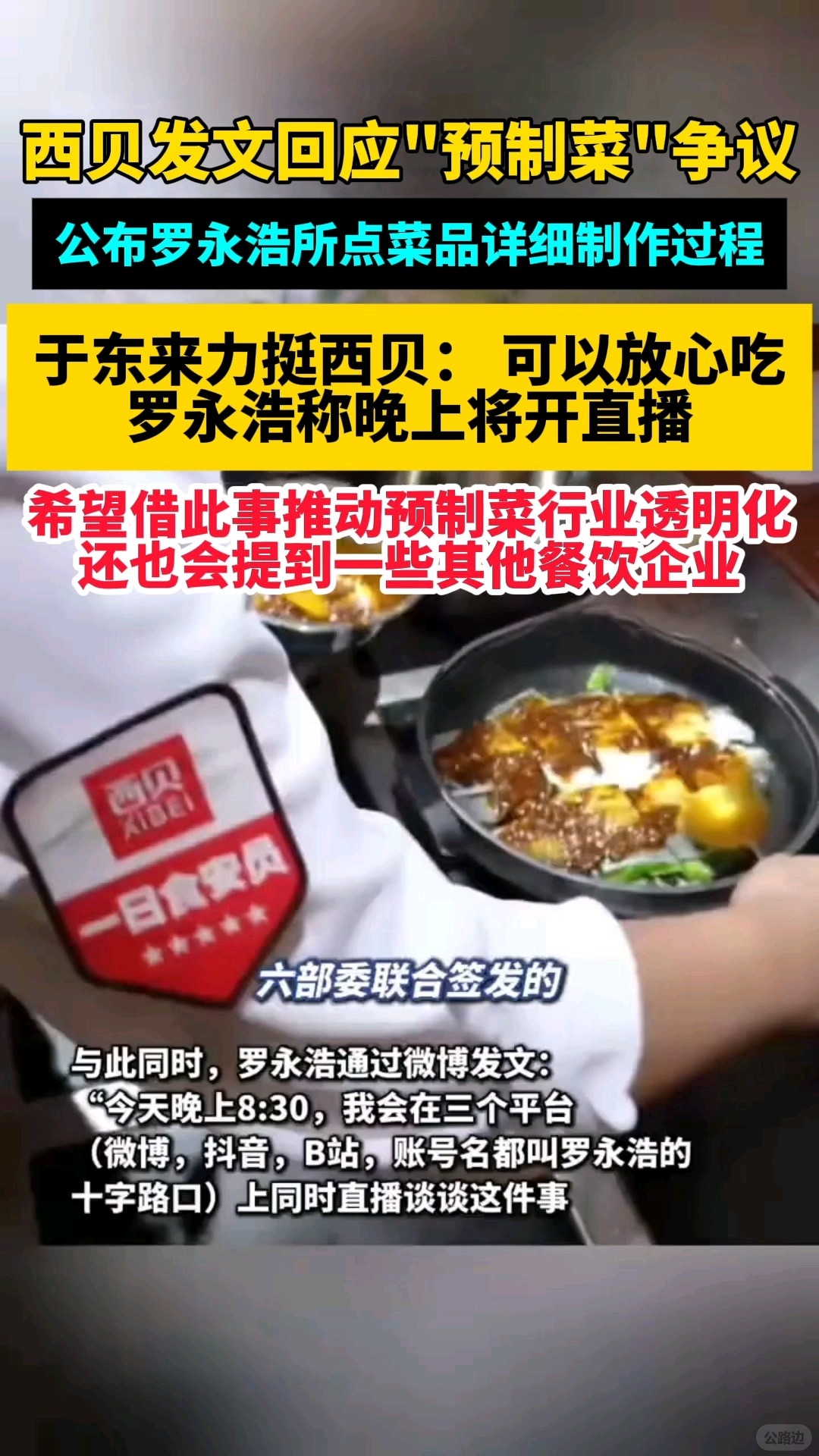 此前,罗永浩发文称:“今天晚上8:30,我会在三个平台(微博,抖音,B站,账号名都叫罗永浩的十字路口)上同时直播谈谈这件事。我的诉求并不是打这个西贝,或是贾老板,我对他们没什么兴趣。但我很希望借着这次的事件,推动中国预制菜行业透明化,保障消费者的知情权。所以今天晚上也会提到一些其他餐饮企业。” |