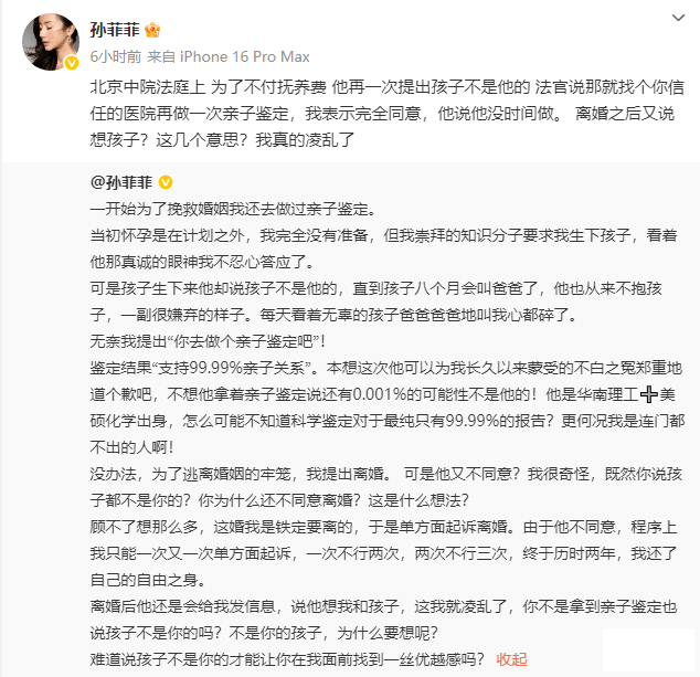 孙菲菲还透露:“离婚后他还是会给我发信息,说他想我和孩子,这我就凌乱了,你不是拿到亲子鉴定也说孩子不是你的吗?不是你的孩子,为什么要想呢?难道说孩子不是你的才能让你在我面前找到一丝优越感吗?”她继续补充道:“北京中院法庭上,为了不付抚养费,他再一次提出孩子不是他的,法官说那就找个你信任的医院再做一次亲子鉴定,我表示完全同意,他说他没时间做。 离婚之后又说想孩子?这几个意思?我真的凌乱了。”