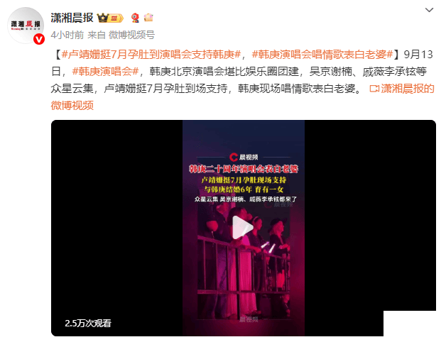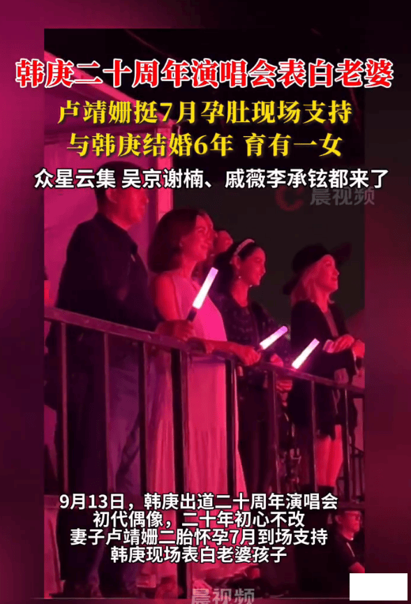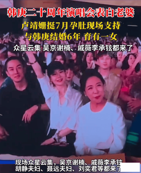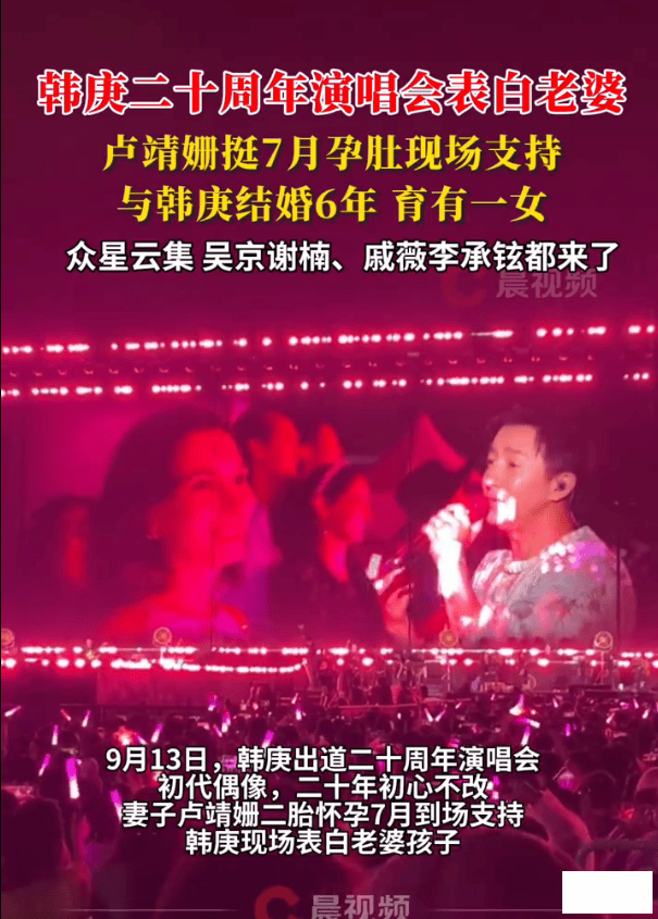 9月13日,韩庚北京演唱会堪比娱乐圈团建,吴京谢楠、戚薇李承铉等众星云集,卢靖姗挺7月孕肚到场支持,韩庚现场唱情歌表白老婆。