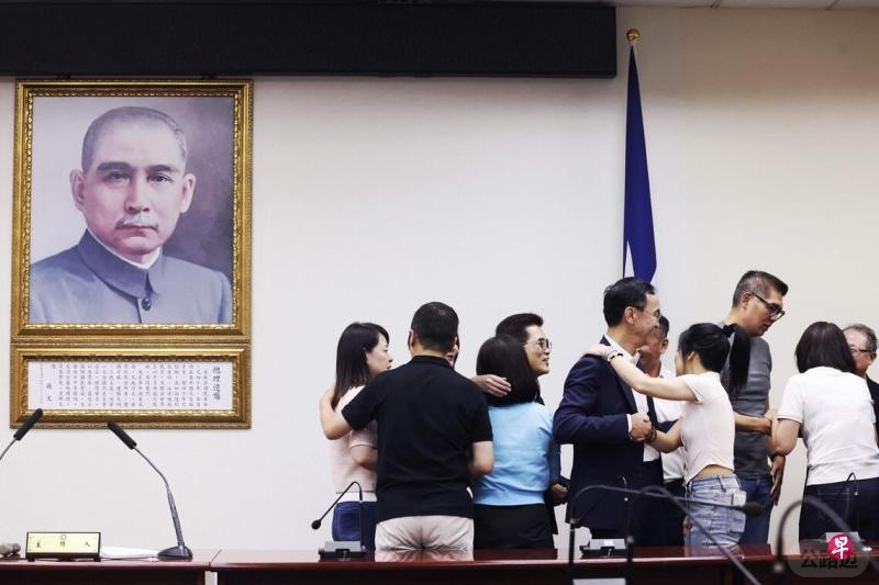才克服大罢免挑战的国民党本应声势大振,却随即陷入党主席选举僵局。图为国民党党主席朱立伦(前排右三)、副主席连胜文(后排右一)等党务主管,7月26日在大罢免首轮投票结果出炉后,与度过危机的自家立委握手拥抱,相互庆贺。