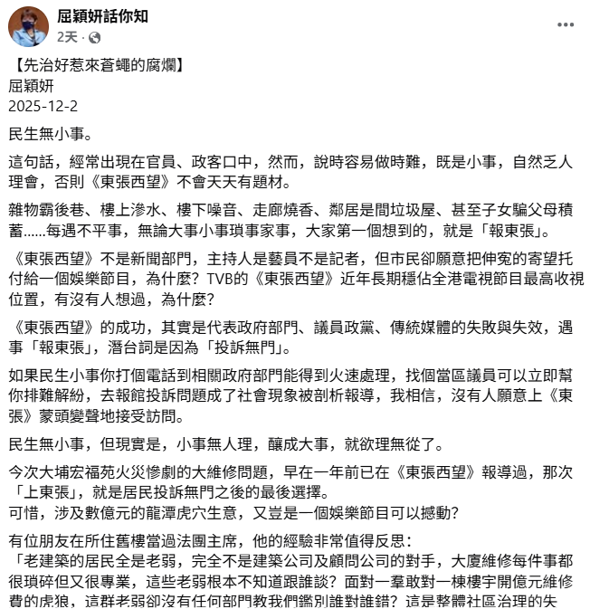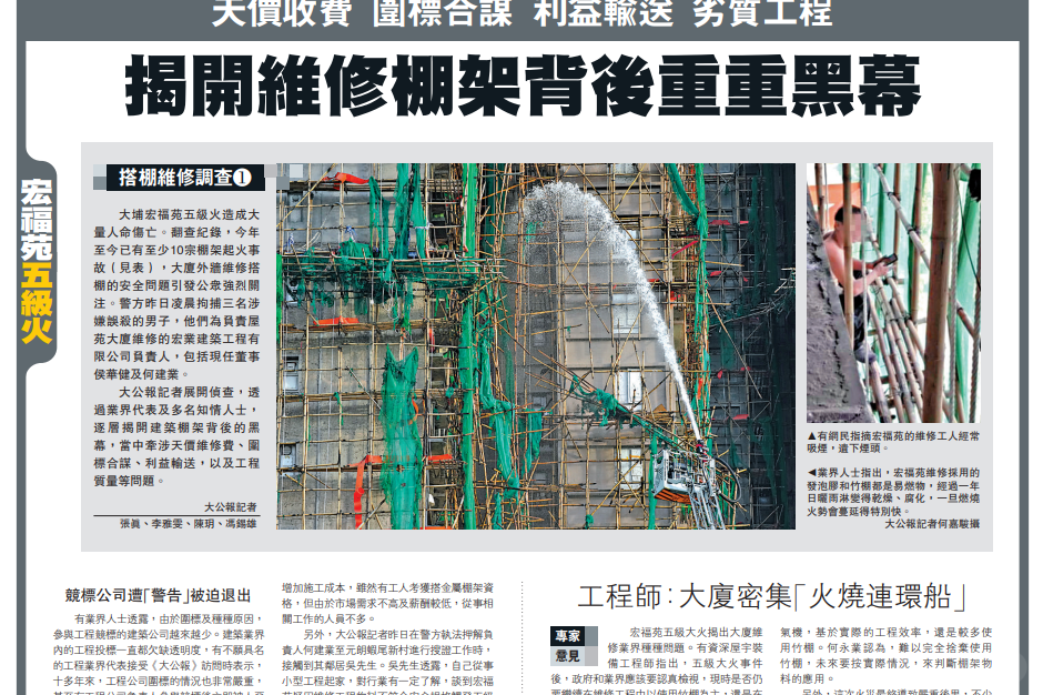 星期三(12月3日),已是香港发生近80年来最严重火灾的第八天。港府在这一天宣布全港拆棚网:所有正在进行维修、外墙覆盖了棚网的楼宇,不论是公家或私人的,都必须立即拆网,并在星期六(12月6日)前完成。 这一雷厉风行的措施背后,与连日来不断曝光的棚网监管问题有关。 综合《明报》、香港电台网等港媒报道,香港保安局局长邓炳强及发展局局长甯汉豪星期三傍晚在政府总部会见传媒。甯汉豪宣布,所有正在进行大维修的公、私楼宇,如果外墙有棚网,须即时将棚网下架,星期六或之前须完成。报道称,目前正在做大维修而还有棚网的私楼,大约有200多座。 至于棚网下架后,不符合规定的棚网会否被“放生”,甯汉豪说,若化验报告显示,有棚网不合标准,当局会追究到底。 她同时称,按照最新情况,怀疑有人在文书上造假。据报道,柴湾峰华邨、炮台山富泽花园、长沙湾怡阁苑及屯门怡乐花园均有棚网检测报告疑似作假。 12月4日,在香港沙田的穗禾苑,工人们正在拆除楼宇外墙的棚网。 邓炳强也提到,怀疑有屋苑维修时使用的棚网涉及行使虚假文书,涉及柴湾峰华邨和炮台山富泽花园,并指两个屋苑的棚网证书报称由山东一家公司生产,并获“国家劳动保护用品质量监督检验中心”或“滨州市检验检测中心”发出棚网阻燃合格检测报告。 但警方发现,“国家劳动保护用品质量监督检验中心”并无发出相关证书,以及无法联络“滨州市检验检测中心”。邓炳强说,警方已就此展开调查,并由港岛总区重案组跟进。 邓炳强还说,港府已经与中国大陆相关单位联系,大陆方面会全面配合调查,同时预计警方会就更多类似案件展开调查。 网媒“香港01”星期一(12月1日)曾致电“国家劳动保护用品质量监督检验中心”,并转述职员称中心已在2019年改名,删去“监督”二字,如今名为“国家劳动保护用品质量检验检测中心(北京)”。职员还说:“2019年以后发出,带监督两个字的都是假报告。” 至于“滨州市检验检测中心”的报告,香港01在检测中心官网的查询系统没有找到纪录。 香港大埔宏福苑上星期三(11月26日)发生大火,至今造成159人死亡。这场大火发生前,宏福苑正进行维修,八座大楼都搭架了竹棚及棚网,各住宅单位的窗户也被发泡胶板围封。 香港政务司司长陈国基早前交代调查进展时说,当局在其中四座大楼检取20个棚网样本,其中七个位处高、中、低层不同地方的样本未达阻燃标准。 据路透社报道,截至目前,香港警方已就这场火灾逮捕了21人。其中15人来自多家建筑公司,涉嫌过失杀人。另有六名消防设施安装承包商因涉嫌诈骗被捕。 亲建制港媒发文披露黑幕 随着案件扩大、官方深入调查,外界逐渐意识到,这场灾难的复杂性远超最初想像,涉及的不仅仅是承包商是否失职,而是一个长期被忽视的行业生态。 亲建制的港媒《大公报》上星期五(11月28日)罕见地刊登一系列报道,当中解析屋苑维修费、围标(也称为串通投标)合谋、利益输送等问题。 这系列题为《揭开维修棚架背后重重黑幕》的报道共有四篇。其中一篇引述不愿具名的工程业界代表说,十多年来,香港工程公司围标的情况非常严重,甚至有工程公司负责人参与竞标后立即被人恶言警告,无奈退出竞标,“导致有水准的公司越来越少,没有多少间公司投标,竞标的结果自然就来来去去都是那几间了”。 这名工程业界代表形容,这种情况在业内已维持一段长时间。 他还说,此次负责人被捕的宏业建筑工程,是业内有名的竞标“常胜将军”,“他们接了很多工程,但试问这么多工程,哪有这么多资源投入呢?”业内常有偷工减料或用劣质材料等事情;更甚的是投标价低者得,不少中标工程公司往往会以拉长工程期的做法来继续让业主多些掏钱,以补回低价中标的利润,“这些不时发生的事,在业内知情者看来是见怪不怪”。 大公报上星期五(11月28日)刊登题为《揭开维修棚架背后重重黑幕》的系列文章。(截图取自《大公报》电子版) 宏福苑八座大楼自去年7月起展开大维修工程,至今已超过一年,整个工程涉款3.3亿元(港元,下同,5500万新元)。德国之声中文网引述其中一名居民Anna说,她已经付了15万6000元的维修费。 《大公报》文章也引述不具名的建造业界人士透露,维修棚的阻燃网,每张约90元,没阻燃功能的普通网仅售50多元,而且阻燃网被太阳久晒后会变脆,只用一次就要扔,普通防护网则可以不停重用。这名人士说,宏福苑火灾发生前,相关部门甚少巡查,不少行内人士抱着侥倖心态,铤而走险。 文章也引述一名从事小型工程起家,对行业有一定了解的吴姓男士说,有宏福苑居民指此次大火的起因与搭棚工人经常吸烟、丢下烟头,疑燃点防护网触发大火有关。 吴先生坦言有关情况是常态,“很多(工人)教不听,工人很多读书少,吸烟是几十年的习惯”。 他还说,低价中标的公司工程延期也是常事,“发泡胶和竹棚都是易燃物,经过一年的日晒雨淋,竹棚变得更干燥、腐化,一旦燃烧火势就会特别快蔓延;加上近日天气干燥又大风,所以宏福苑的大火,才会在短时间内就从底层蔓延到顶部,还连累了相邻的楼宇”。 在棚网和发泡胶板成为宏福苑大火迅速蔓延的最大嫌凶后,据橙新闻报道,有民众发现香港多区维修中的屋苑急拆棚架。有屋苑居民拾起工人拆下的棚网碎片测试阻燃性,“拿了些碎片去烧一下看看有没有阻燃性,哪知道是