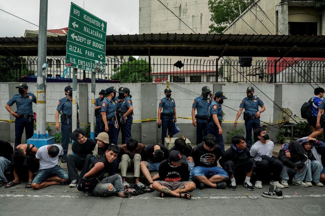 菲律宾首都马尼拉星期天(9月21日)爆发大规模示威。一些抗议者被警方拘捕后,铐着双手坐在马路边,他们大多数都是年轻人。
