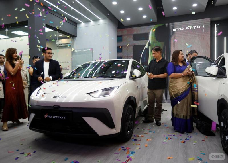 受國內電動車市場內卷沖擊,全球最大電動車企比亞迪季度利潤三年來首次下滑。圖為加德滿都市民8月初在當地汽車展上,查看比亞迪ATTO 1車型。