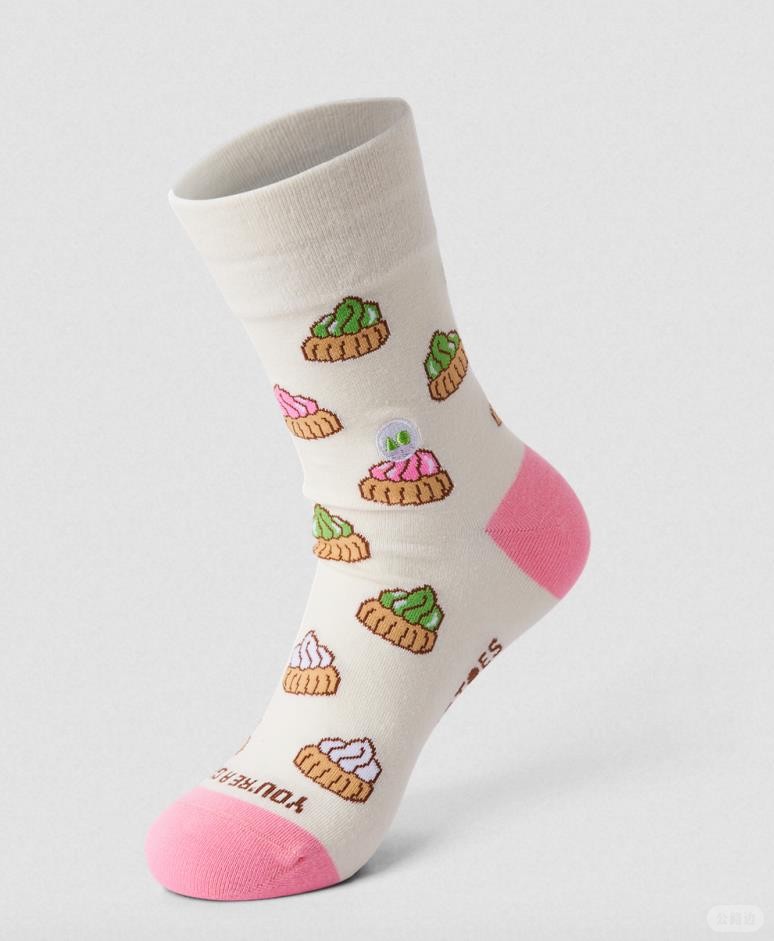 古早零食励志袜子 “Talking Toes”袜子印上糖霜肚脐饼,还有一行暖心话:“你珍是个宝”(You’re a Gem)。