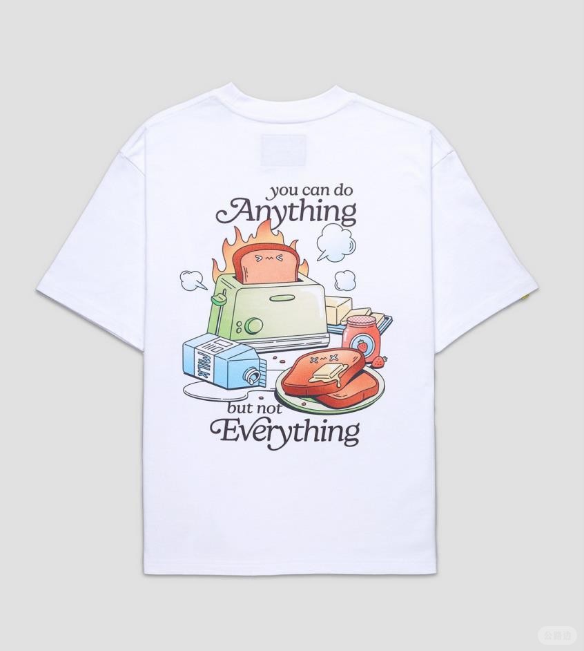 Talking Toes近日也推出T恤,并将激励语与美食图推上一层楼。烤焦的吐司、倒翻的牛奶,早餐桌上灾难现场,四行字“想做什么就去做,可你不能全都做”(You Can Do Anything, But Not Everything),“祝君早安”也劝君勿操之过急,一样一样来。