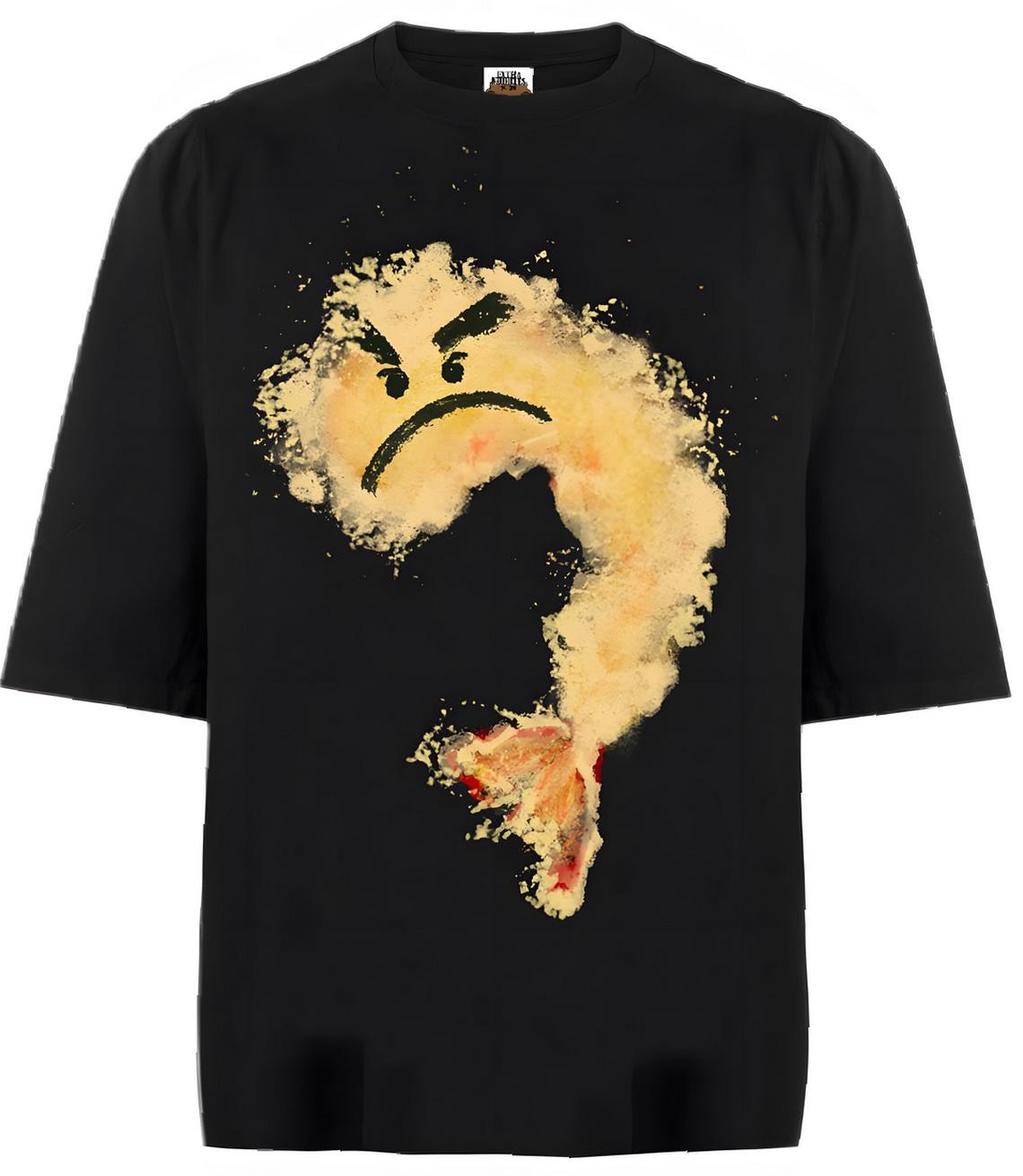 本地潮牌“面屋店”(Extra Noodles)设计师一定很爱面食,无面不欢,每次点餐必要加面,爱面爱到将品牌取名“面屋店”。“面屋店”也将各种面食搬上长短袖T恤,画风粗犷、童稚、率性,有狂吃日本叉烧拉面、天妇罗拉面的小熊,戴高帽的小熊厨师,各款快熟杯面等。最抵死的是一大块天妇罗炸虾点缀的黑T恤,搞笑之余又叫人食指大动。 “面屋店”天妇罗大虾图T恤。