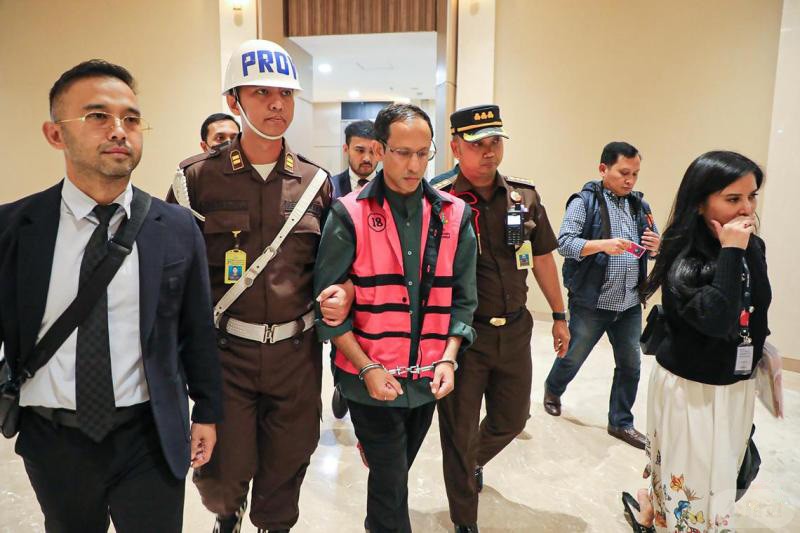 Gojek创办人纳迪姆(中)被指在教育、文化、研究与科技部长任内,未按照常规招标程序采购科技产品,星期四遭检方拘留。(取自印尼总检察署官网)
