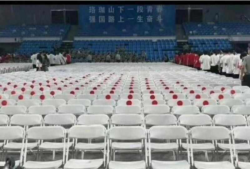 中国・武漢大学で金曜日(9月5日)に行われた大学院生の入学式で、スタッフが白い座席の一部に赤い丸ラベルを貼り、日本国旗に酷似しているとネットユーザーから疑問視された。(インターネット)