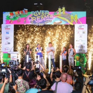 新加坡河畔节开幕仪式在驳船码头一带举行,国家发展部长徐芳达(中)与(左起)新加坡设计理事会执行董事林娴、新加坡河畔商家协会主席孙文彬,以及市区重建局总规划师兼副局长陈俏玲一起主持仪式。 ...