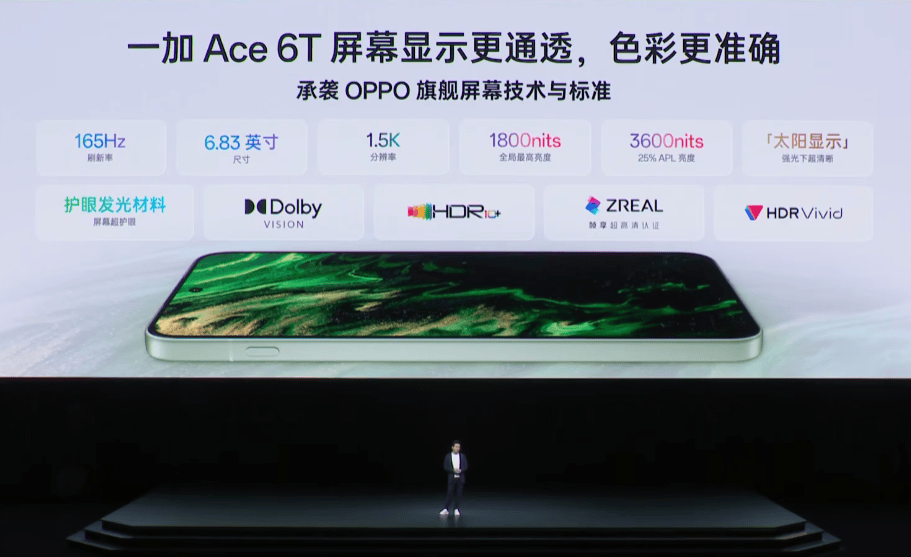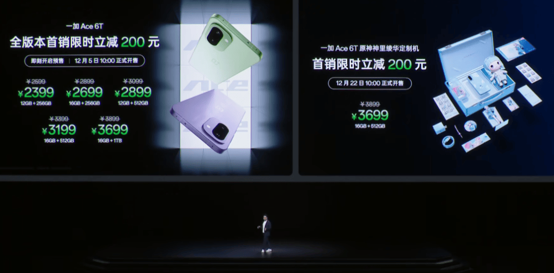 就在今晚,一加把 Ace 6T 端了上来! 配置这块虽然果子此前已经跟你们聊过几遍了,但看点多少还是有的... 特别是价格,有自家已经降价的 Ace 6 挡在前面的情况下,果子想看看一加能给到 Ace 6T 什么样的价格? 让我们拭目以待吧~ 首先一上来,一加就秀出外观! Ace 6T 采用旗舰同款的金属魔方模组设计跟丝绸玻璃工艺; 拥有跟 Ace 6 相近的金属中框、正面超窄边屏幕; 掠影绿、闪速黑、电光紫三色... 电光紫配色更是独占玻纤材质跟特别 Ace 标渐变纹理后盖设计: 果子会比较喜欢这个配色,紫色有韵味不说~ 看过 Ace 6 类似设计的「快银」配色,还是很酷的。 配置上,一加 Ace 6T 如期全球首发骁龙 8 Gen5(第五代骁龙 8)芯片! 这颗芯片的规格之前果子也跟你们聊过了,这边就直接略过了... 安兔兔大概 356W 分的成绩,仅此于骁龙 8 Elite Gen5(第五代骁龙 8 至尊): 为什么会这么猛呢? 一加自信表示因为塞进了总面积最大的散热系统: 还在芯片底层里写进了自家招牌的新一代「风驰游戏内核」! 有了更强的性能加持,一加宣布在 Ace 6T 上行业首发《和平精英》原生 165 超高帧模式: 并且宣布我们常玩的主流 FPS 游戏全面支持原生 165 帧。 果子看了下,有《三角洲行动》、《穿越火线》、《暗区突围》、《使命召唤》... 应该都是你们常玩的吧? 这还没完呢~ 一加还要全面征服 5 大类电竞手游 165 帧! 能带领行业手游向 165 进发,果子我肯定是双手双脚支持的。 至于国民手游《王者荣耀》,Ace 6T 也是支持原生 144FPS+ 极致画质。 Ace 6T 还带来了行业独家的 GPU 渲染超帧技术! 借助这项技术,不仅能拥有媲美 PC 视效的游戏帧画品质... 还能做到别家做不到的 144 帧、120 帧无限满帧向下兼容: 哪怕是一边高画质游戏一边微信视频聊天或小窗看视频啥的,一加表示都能一样满帧。 别家都是 120 帧 + 1.5K 画质同开是吧? Ace 6T 能做到 165 帧 + 1.5K 画质同开! 确实猛~ 屏幕的话,都支持 165 了肯定是用的 165Hz 屏幕! Ace 6T 正面采用了一块 6.83 英寸 1.5K 165Hz 直屏... 支持 1800nits 的全局最高亮度跟 3600nits 局部峰值亮度; 在拥有 OPPO 旗舰下放的技术跟标准下,还做到了 3840Hz PWM 护眼; 1nit 超低亮度显示、3D 超声波指纹、湿手触控也都标配。 为了在超高帧率下有更好的游戏触控体验... Ace 6T 还搭载了独家自研的灵犀触控芯片! 什么五指 330Hz 触控采样、十指 290Hz 触控采样、3200Hz 瞬时触控采样,各类游戏触控都照顾到了。 让果子更想不到的是~ 对于陀螺仪玩家,一加还内置了 PS5 游戏手柄同规格陀螺仪! 说是瞄准不抖动、回中更精准、准星不漂移、操作更更还原。 针对我们长时间游戏时横向握持手机烫手等问题... 一加同样都想到了。 看得出来为了我们能有更好的游戏体验,Ace 6T 一加还是下了功夫的~ 最后再给到 8300mAh 大电池支持旁路充电的 100W 有线闪充; 拥有 OPPO 旗舰算法下放的 5000 万像素 IMX906 OIS 主摄跟 IP66+IP68+IP69+IP69K 满级防水... 你们觉得这次 Ace 6T 怎么样? 来到激动人心的价格环节: 12+256GB 2599 元(首销 2399 元) 16+256GB 2899 元(首销 2699 元) 12+512GB 3099 元(首销 2899 元) 16+512GB 3399 元(首销 3199 元) 16GB+1TB 3899 元(首销 3699 元) 还有一款原神神里绫华定制机: 16+512GB 3899 元(首销 3699 元) 这个价格你们觉得怎么样? 果子觉得没想象中的低,特别是现在 Ace 6 256GB 基础版做到跟 Ace 6T 一样的价格下,哪怕其它版本也只比 Ace 6T 贵个小 200 ... 考虑到 8 Gen5 跟 8 Elite 的差距,果子觉得还是 Ace 6 更香点。